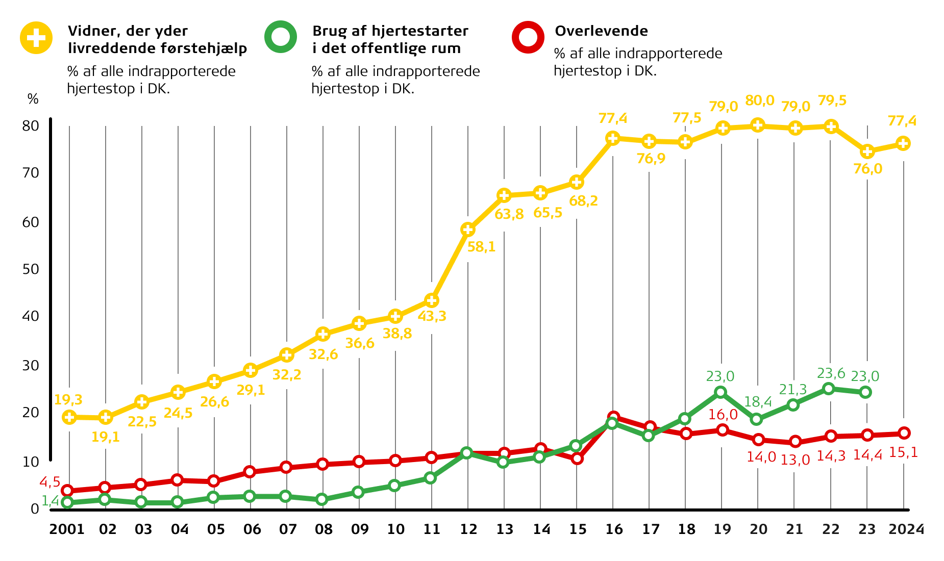 Nedenfor kan du se udviklingen i nogle af de vigtigste tal på hjertestopområdet i Danmark.